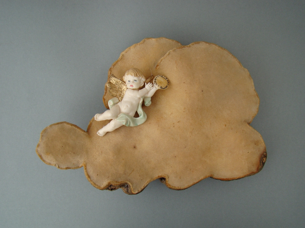 Handwerklich sind die Schwierigkeiten des Zusammenfügens so vielfältig wie die Materialien. Vieles klären 2-Komponentenkleber, Heißkleber, Polyester und Weißleim, wann immer es geht/ nötig ist mit Dübel und Verstärkung. Auch das Festhalten und Anpassen der immer unregelmäßigen Teile ist schwierig. Aber die heikelste Aufgabe ist dem Hirn gestellt: Welche Idee legt ein Objekt nahe? Oder: Welche Zutaten braucht es für eine Idee, die ich darstellen will? Was soll das Produkt ausdrücken? Welche Assoziation, welchen Gedanken soll es, kann es anregen? Viele interessante Fundstücke liegen jahrelang in meinem Fundus, bis eines Tages ein weiteres Element erscheint und das Konzept aufblitzt, z.B.: Über 15 Jahre war offen, was aus einem kapitalen mehrteiligen Baumpilz werden konnte, bis eines Tages an der Fonte Clitunno in Umbrien ein Putto flüsterte: „Ich bin der Putto auf der Wolke.” Und da sitzt nun das italienische Kitsch-Figürchen auf dem außergewöhnlichen Zunderschwamm, den ich vor Jahren vom Baumstamm hackte. Oder der Wal-Knochen: die naive Vorstellung der Walfontäne (Fontaine de Baleine) machte die Verbindung zu drei maritimen Zutaten, Schwamm, Schere und Muschel.