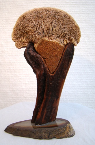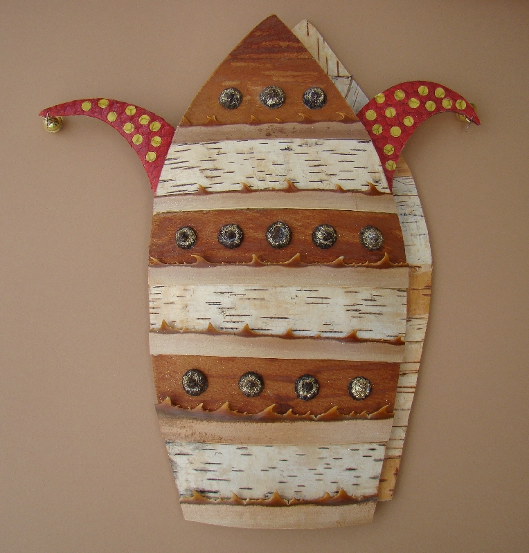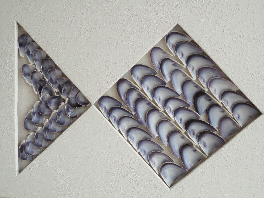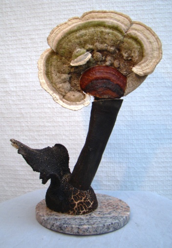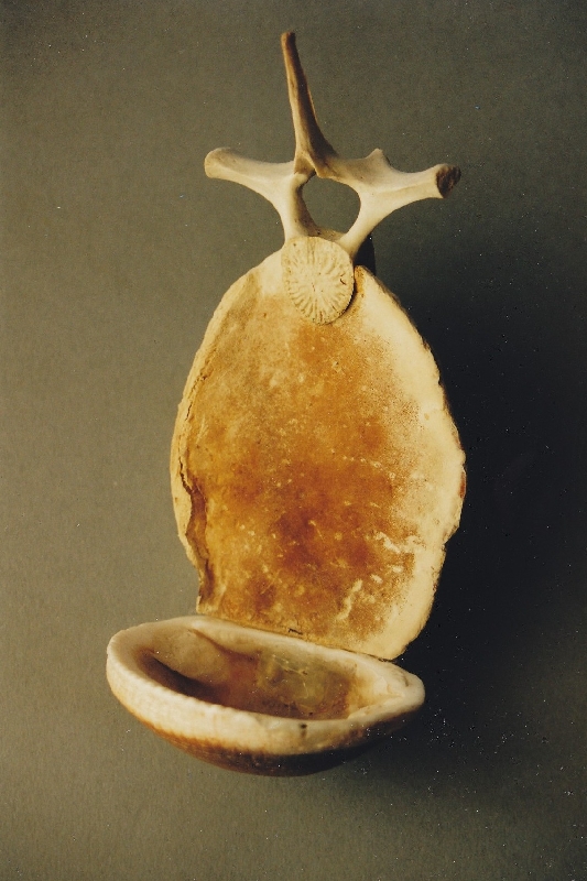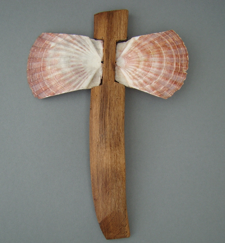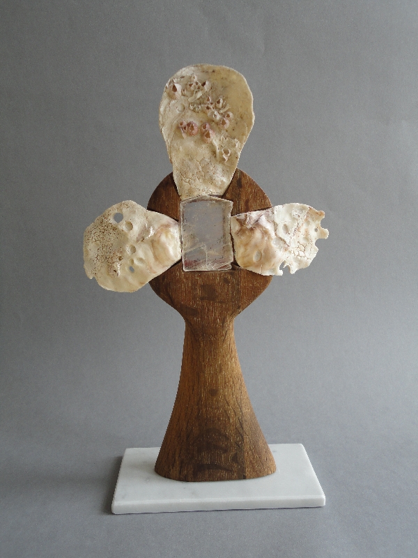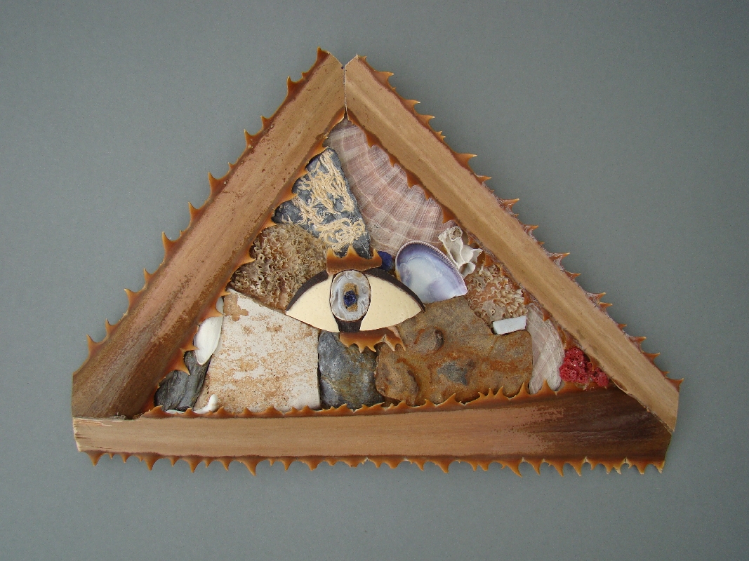 Auch die christliche Religion ist voll von Symbolik und Insignien. Eine Zeitlang baute ich christliche Symbole in einer Mischung aus Ironie und Respekt vor ihrem kulturellen Impact. Muschel und Baumpilz fügen sich zum sakralen Objekt der Weihwasserschale, deutsche Birkenrinde mit afrikanischer Eukalyptusrinde, kombiniert mit den Sägestielen einer Fächerpalme kombinieren sich zur Tiara. Das Auge Gottes, das alles erkennt, schaut auf Fundstücke des Meeres und Bodenschätze; es sieht und weiß alles. Die Menschen projizieren ihren Wunsch, alles zu wissen auf den allwissenden (alt-testamentarischen) Gott. Dem christlichen Geschichtshintergrund lässt sich auch ICHTHYS zuordnen; seine Muschelschalen bilden einen stilisierten Fisch. Wort und Icon des Fisches waren Geheimzeichen und Glaubensbekenntnis der römischen Urchristen, ein Akronym welches besagte, dass Iesus Christos Gottes Sohn und der Erlöser sei.