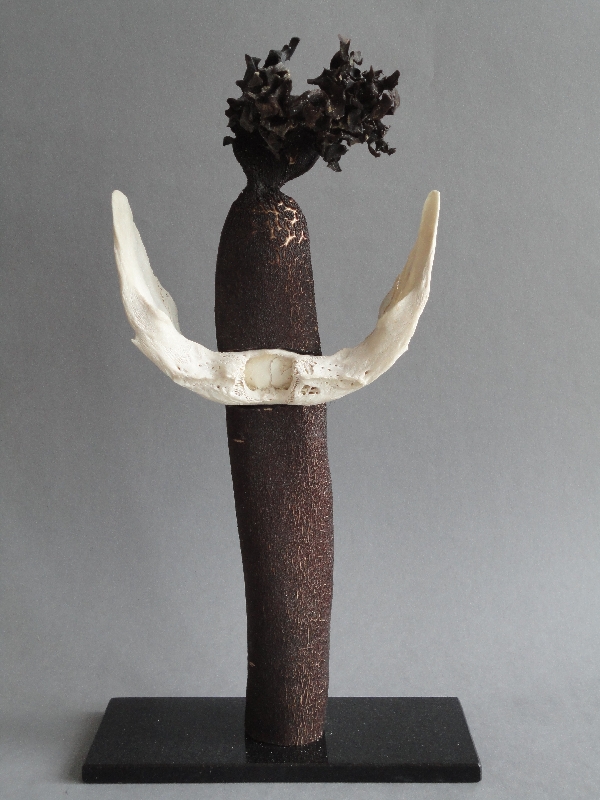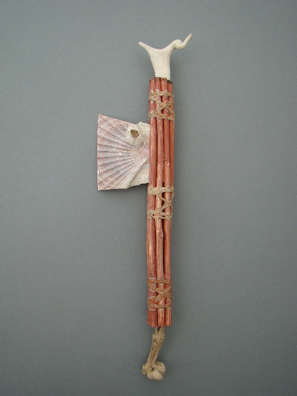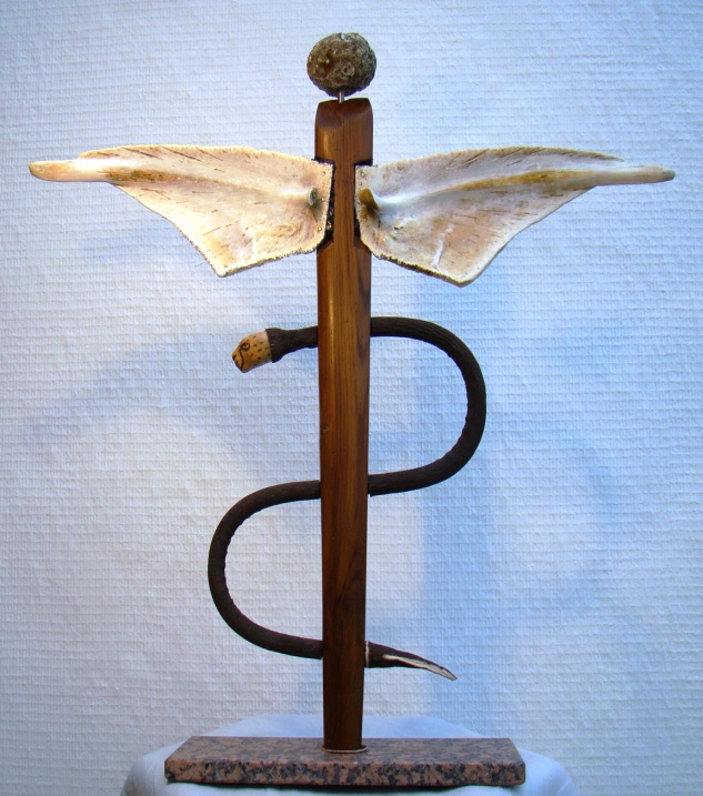 Eines der neueren Werke, der Aeskulap-Stab, ist die Insignie der Pharmazie. Sowohl dieser antike Heiler wie auch der Götterbote Hermes tragen am Wanderstab bzw. am Fuß ein Paar Flügel; hier aus fernab gefundenen Fischknochen (Schulterblätter?) gemacht.