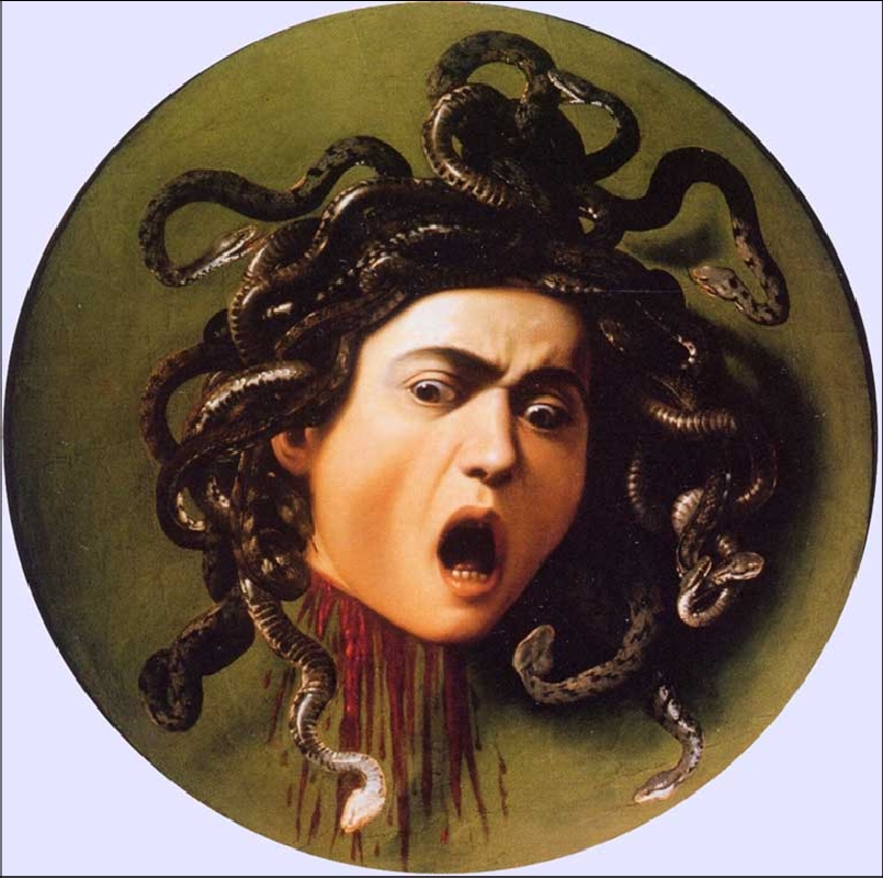 In unsere Mythologie gehört auch Medusa. Sie bekam von Athene Schlangenhaar verpasst und wurde aller Schönheit beraubt, so dass nur ein gerissener Perseus ihr im Spiegel seines Bronzeschildes (um nicht vor ihrer Hässlichkeit zu erstarren) das Haupt abschlagen konnte. Nun hängt ihr Halsgekröse heraus; so malte Caravaggio ein Portrait dieser schrecklichen Schönheit.