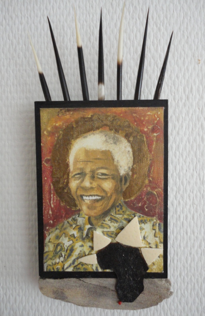 Die Ikone mit Nelson Mandela nimmt Spott über Heiligenverehrung – durchaus wohlwollend – auf und brauchte nur wenige Hinzufügungen wie Kelp, Stachelschweinstacheln, Straußenschale zum Herz Afrikas II.
